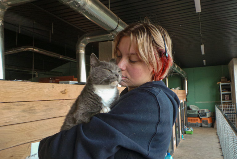 Підходимо також і до котів, де пані Олександра дістає одного з вольєра. Цей пухнастик з білими шкарпетками – Ральф. Він дуже лагідний, тому одразу у відповідь обіймає дівчину. І коли настає час повернення до своєї маленької