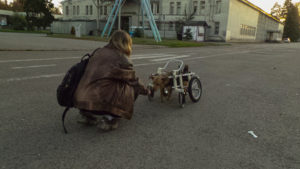 Після екскурсії центром нам дають першого собаку на вигул. Це Ромео. Він уже в поважному віці. На своє ім’я він не завжди відгукується, тому що вперто йде туди, куди сам спланував. Прогулянка не затягнулась, бо Ромео після невеликого кола біля центру потягнув всередину. Тоді ми зголошуємося взяти ще одного песика. Нас попереджають про те, що цей собака особливий і потребує чотири колеса на допомогу. Олександра на руках виносить не дуже великого рудого пса, який має піджаті задні лапи. Це Зара, вона з Херсонської області, одна з перших мешканок центру. Вона потребує особливої прогулянки, де завдяки спеціальному візку, Зара розминає свої лапи. Колись їй для реабілітації навіть купили басейн, але вона не оцінила такий подарунок. Тож Олександра причеплює Зару до візочка й показує, що нам робити. Собачку треба хвалити, підштовхувати та направляти, але вона й сама чудово справляється із завданням. Проте інколи Зара йде на хитрощі, щоб отримати смаколик.